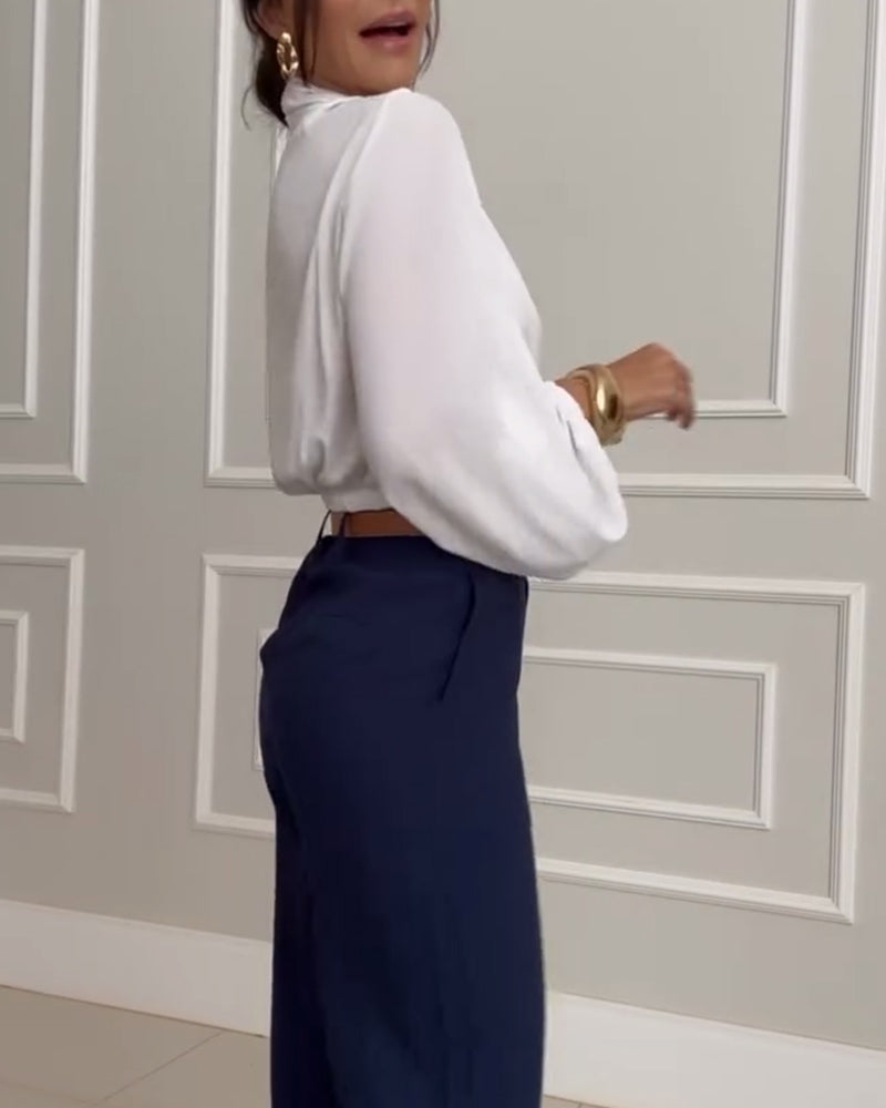 Trendy Lantern Sleeve Blouse with Solid Color V-Neck